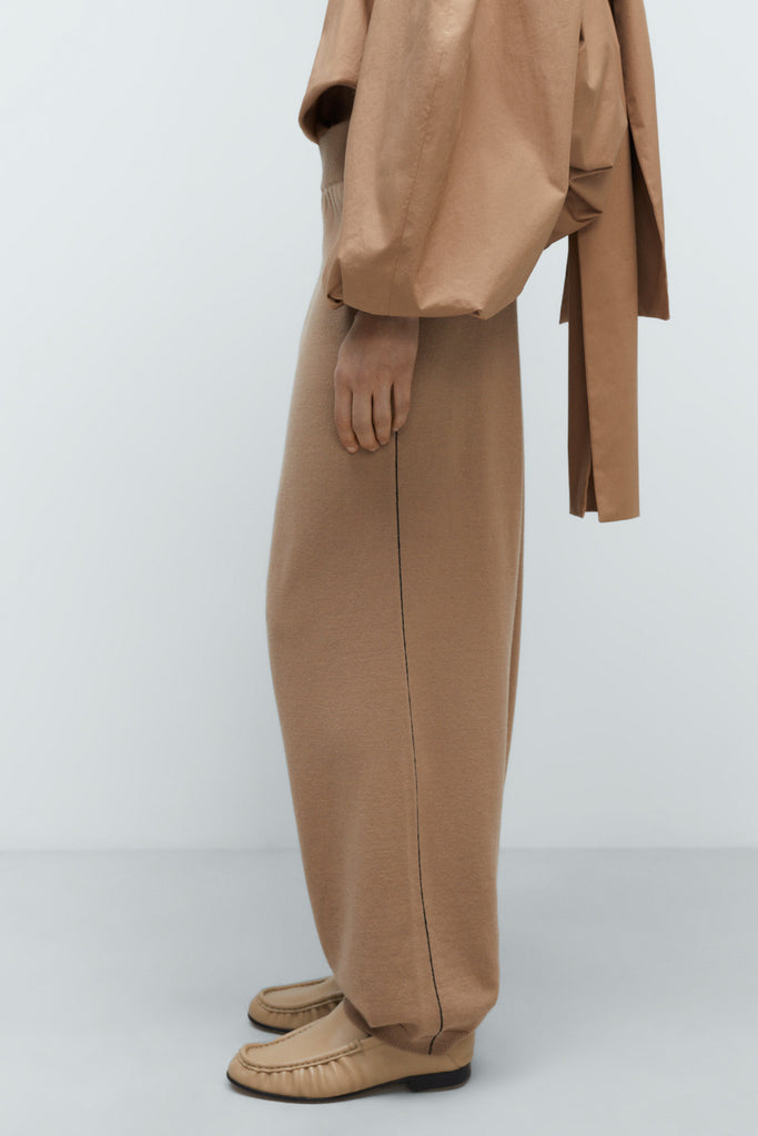 Straight-leg oversized pants crafted from the softest Extrafine Merino Wool; featuring elastic accents at the waist and hem for a relaxed fit. The design is complemented by a sleek, thin black side stripe that adds a subtle touch of contrast.