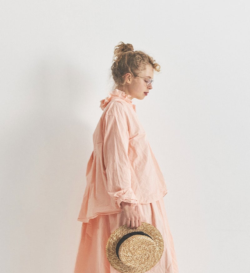 This blouse features a stand-up collar with tucked ruffles. The bodice is also adorned with tucks and gathers, creating a soft, A-line silhouette. This piece balances a feminine design with a casual material. Available in three colors, adding a touch of color to any outfit.