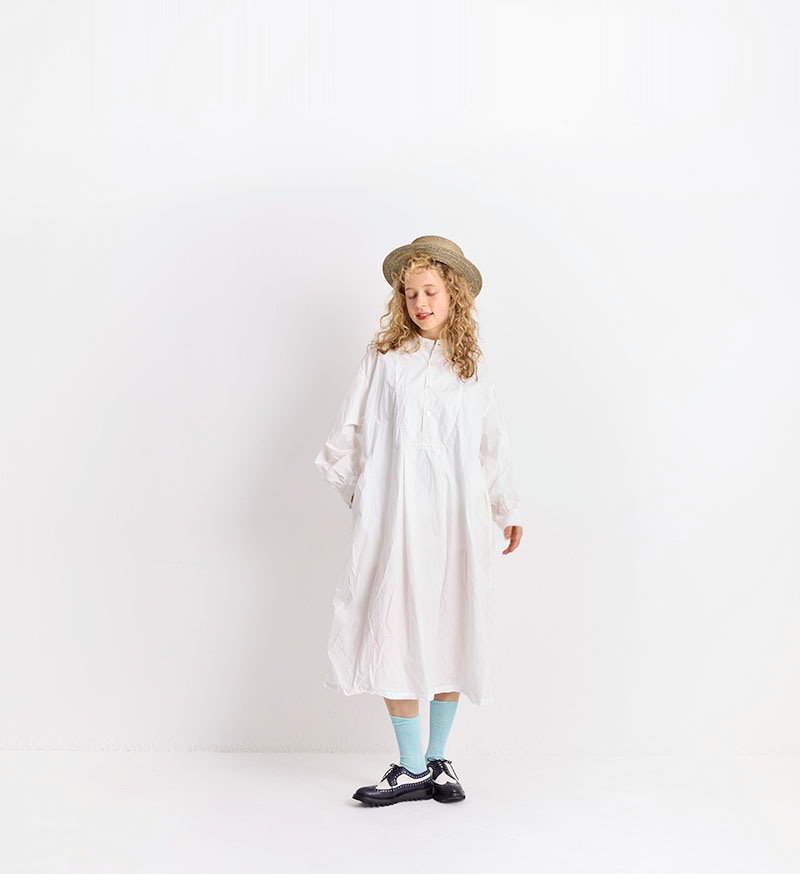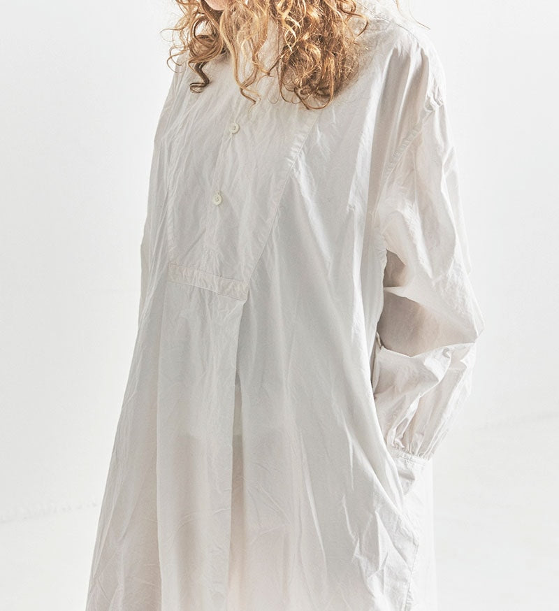This dress, with its front bib and narrow back yoke, is reminiscent of vintage dress shirts. The generous width of the body and sleeves creates a comfortable balance for everyday wear.