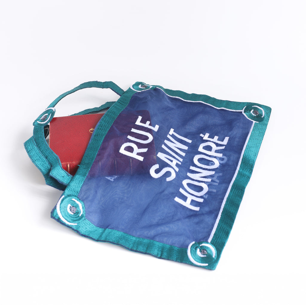 With humour and creativity, Brigitte Tanaka transforms the iconic Parisian street sign into a unique and charming bag. Inspired by Rue Saint Roch, this small transparent organza bag captures the classic style of Paris street plaques with delicate embroidery and an artistic twist.
